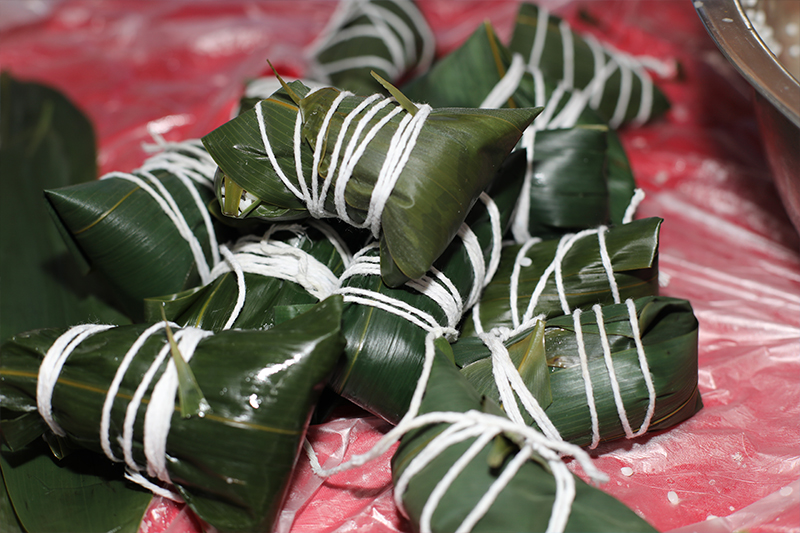 随着活动的开始,心灵手巧的各位同事纷纷拿出看家本领:先拿两三张粽叶卷成漏斗状,然后填满糯米,再裹上粽叶,用粽绳绕住扎紧。不一会儿,漂亮的碧绿色三角形粽子就诞生了,一双双灵巧的手,把自己对生活与节日的热爱全都包进了喷香的粽子里。