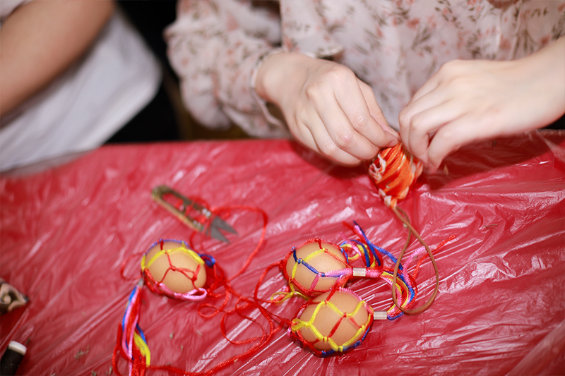 包完粽子,工作人员为在场的同事分发了香囊和蛋兜材料,主持人通过视频向各位演示其制作方式。一根根丝线与五彩绳在大家的手里被编织成了一个个精美的蛋兜和一只只精致的香囊,把鸡蛋放入蛋兜,将香料塞进香囊,这两种编织品就完成了。